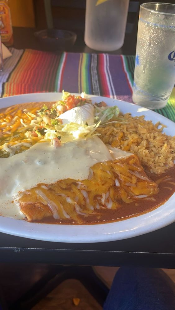 3 enchiladas with our red homemade salsa, choice of chicken or meat. Comes with rice & beans.