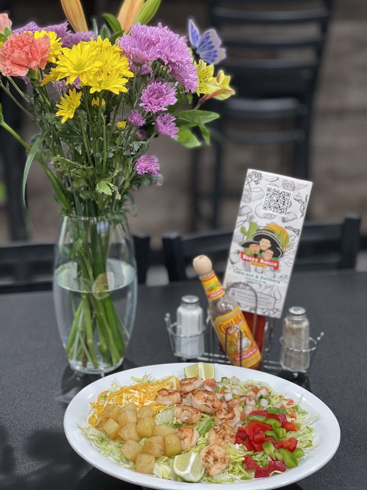 Crispy flour tortilla bowl filled with beans and your choice of ground beef or shredded chicken, topped with lettuce, tomatoes, cheese, and sour cream.